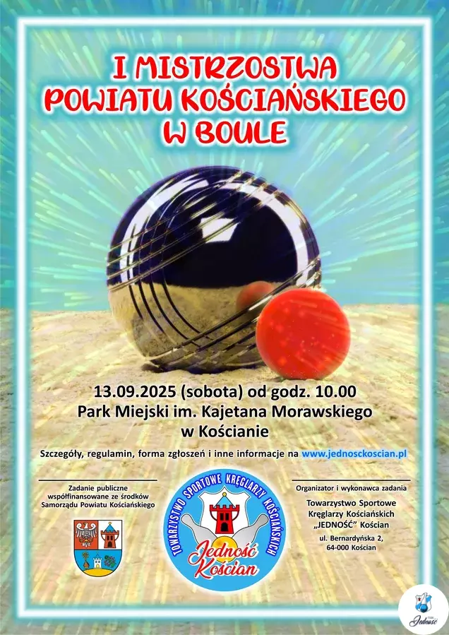 Dnia 13 września 2025r. na terenie parku miejskiego im. Kajetana Morawskiego w Kościanie odbyły się I Mistrzostwa Powiatu Kościańskiego w Boule. Tak jak poprzednie zawody w boule, zawody zorganizowano w historycznym dla kręglarzy TSKK Jedność miejscu, czyli przy dawnej kręgielni DOBRY RZUT, która po pożarze w 1979 roku, mimo zapewnień tamtejszych władz, nie została odbudowana do dnia dzisiejszego.